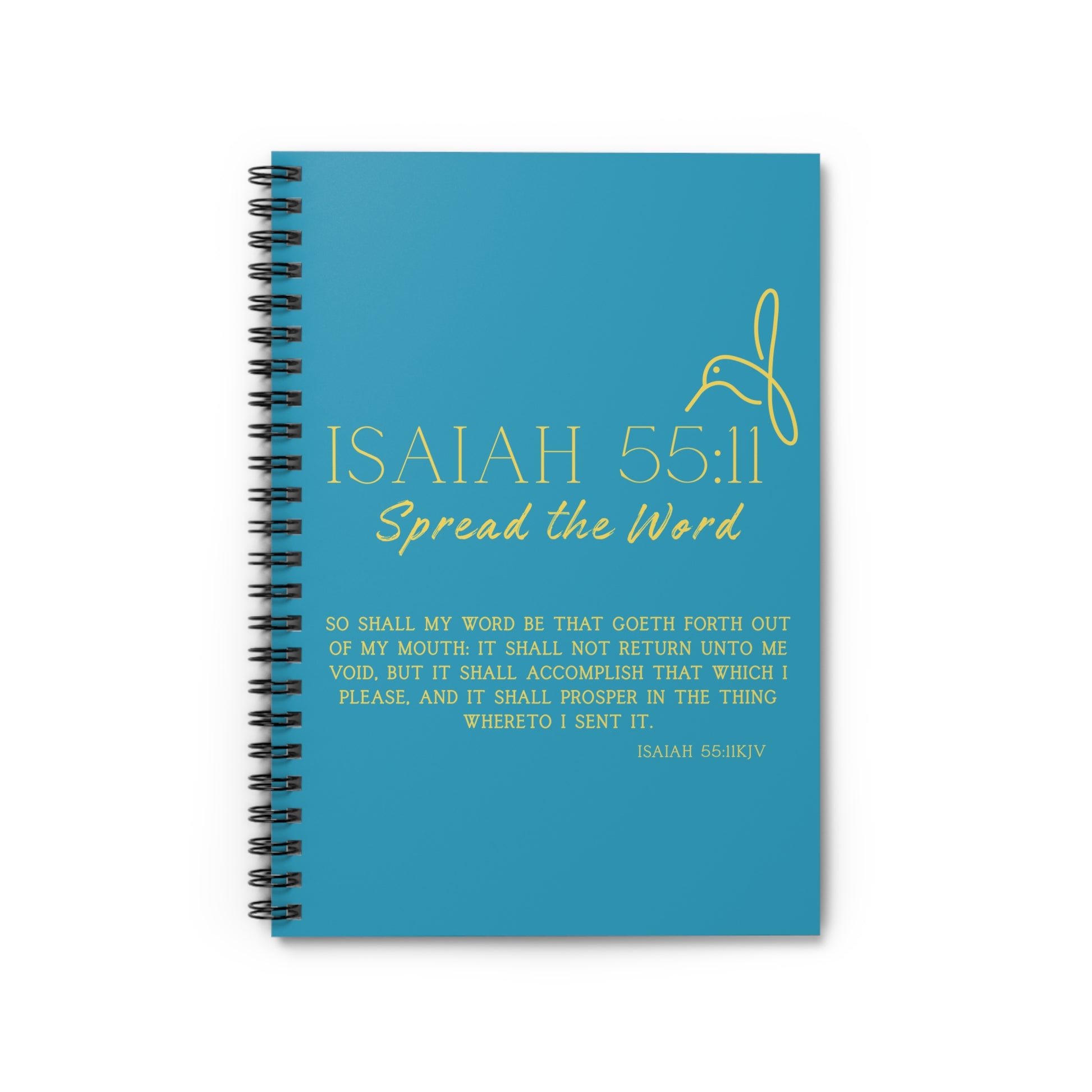 A beautifully designed spiral notebook featuring scripture verse Isaiah 55:11 as a reminder that God is always working. Perfect for bible study or daily journaling to encourage faith and reflection. Ideal for those seeking spiritual inspiration and motivation, relevant for religious holidays and celebrations.